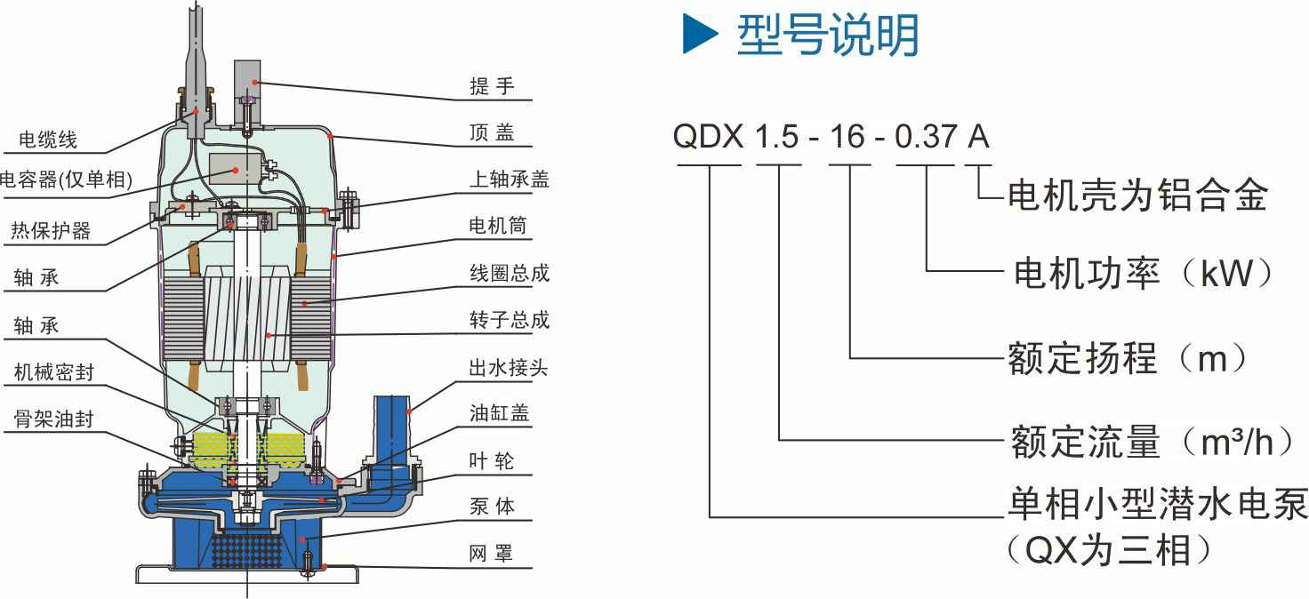 QDX系列产品广泛应用于农业、水产养殖的清水抽送、景观喷泉、园艺灌溉、井下生活用水抽送、建筑施工的积水排放等其它场合。电机采用B级绝缘,内配有热保护器,能在电泵缺相、过载、电机过热等情况下自行断开电源保护电机。